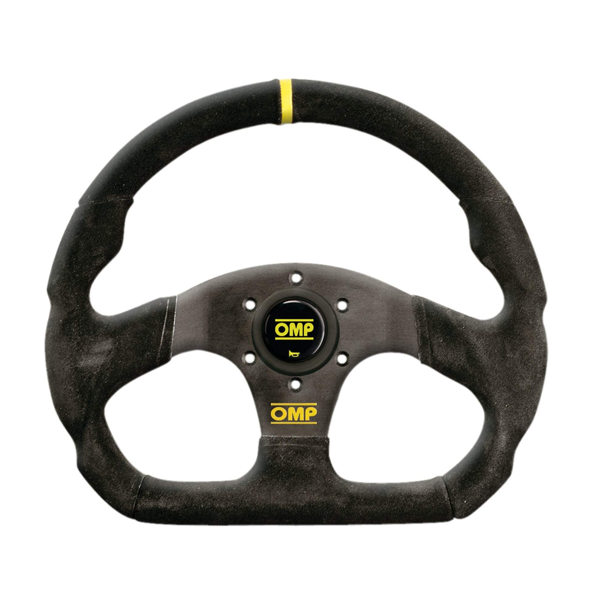 Flat steering wheel , in suede leather , with 3 black anodized spokes .