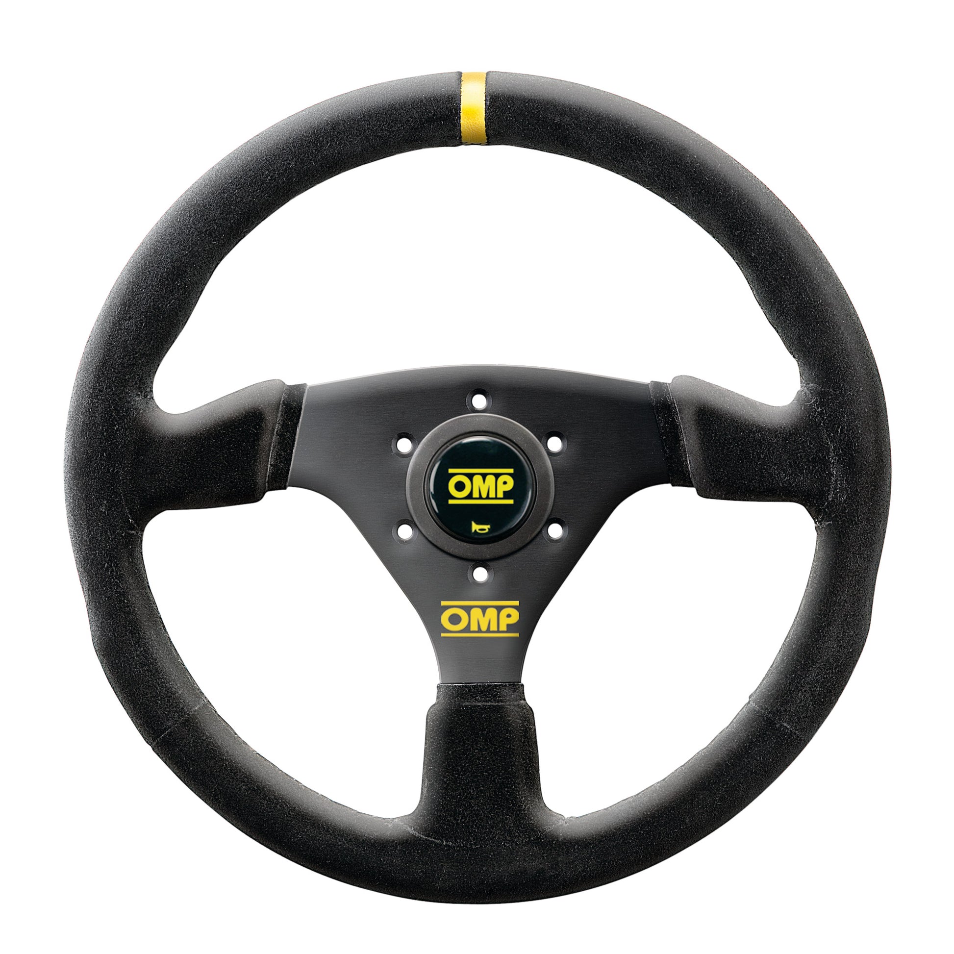 Flat steering wheel , in suede leather , with 3 black anodized spokes .